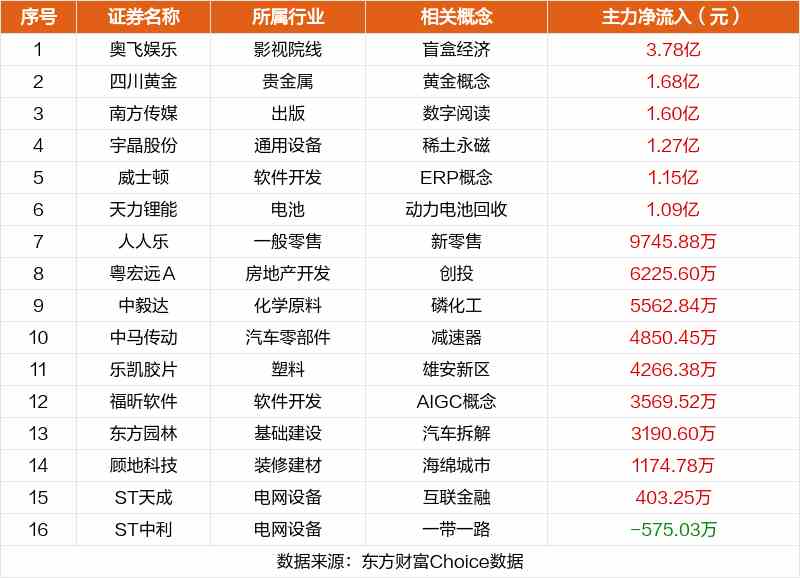 非連板個股方面,奧飛娛樂、四川黃金、南方傳媒主力資金凈流入居前。