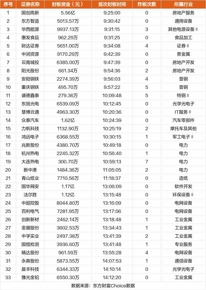 從首次封板時(shí)間角度看,今日33只非ST股中,東方智造、華西能源、惠發(fā)食品等在開盤5分鐘內(nèi)首次觸板。