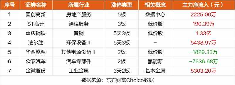 其中,數(shù)據(jù)中心國創(chuàng)高新5板,低價(jià)股ST高升3板,低價(jià)股重慶鋼鐵5天3板。