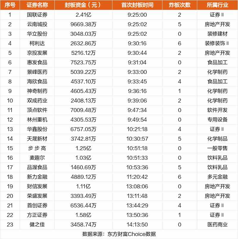 從首次封板時(shí)間角度看,今日23只非ST股中,柯利達(dá)、京投發(fā)展、惠發(fā)食品等在開(kāi)盤5分鐘內(nèi)首次觸板。