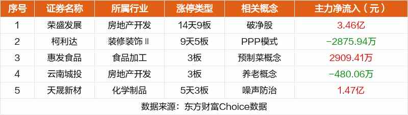 其中,破凈股榮盛發(fā)展14天9板,ppp模式柯利達(dá)9天5板,預(yù)制菜概念惠發(fā)食品3板。