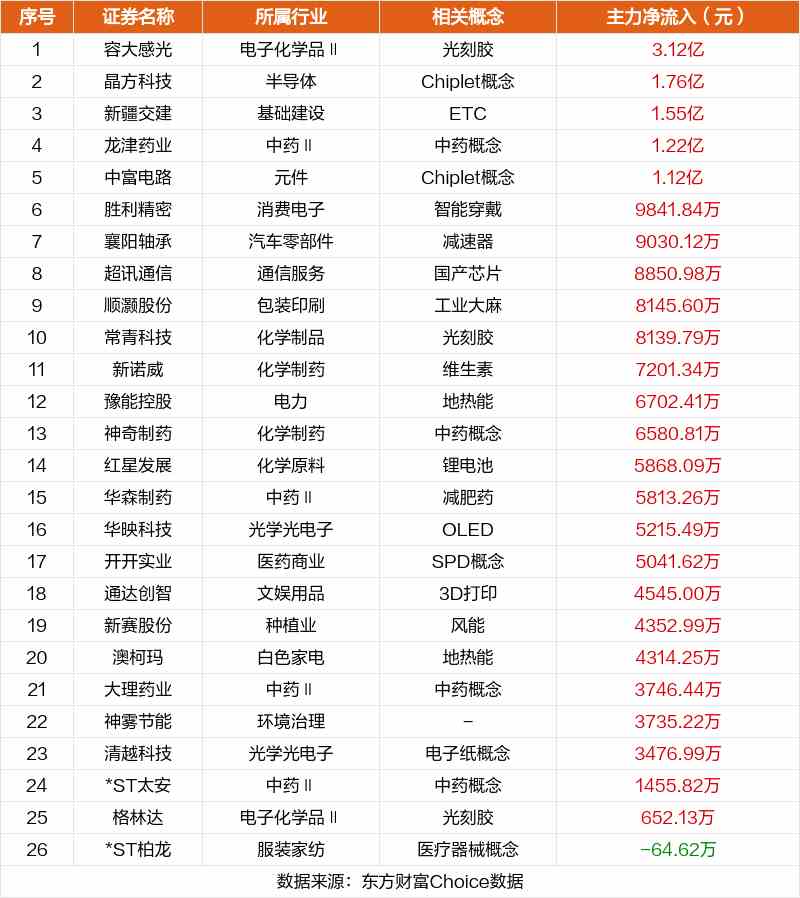 非連板個股方面,容大感光、晶方科技、新疆交建主力資金凈流入居前。
