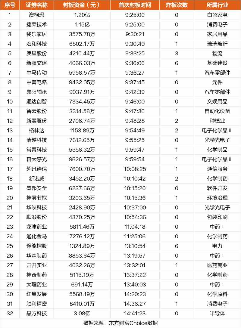 從首次封板時間角度看,今日32只非ST股中,我樂家居、宏和科技、庚星股份在開盤5分鐘內(nèi)首次觸板。