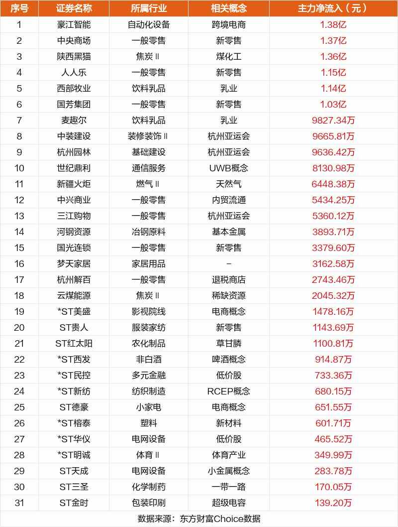 非連板個股方面,豪江智能、中央商場、陜西黑貓主力資金凈流入居前。