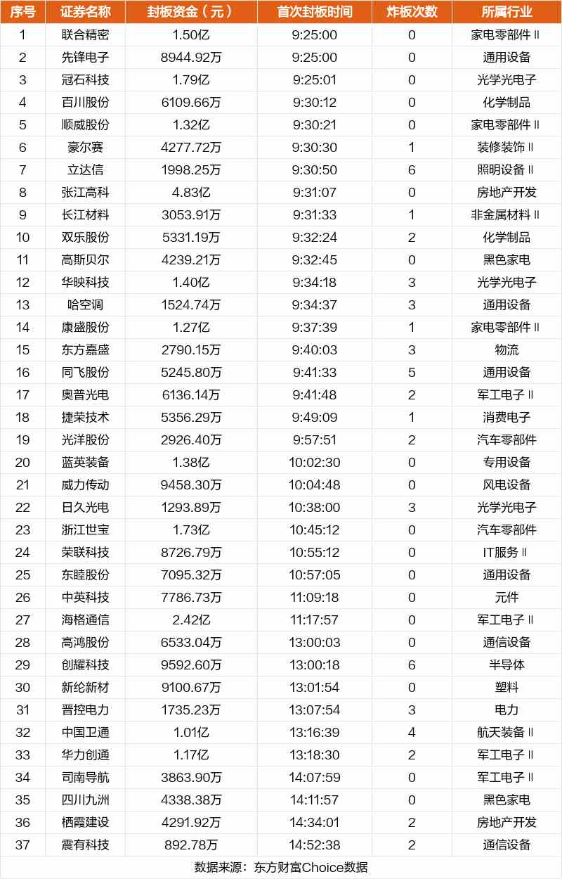 從首次封板時(shí)間角度看,今日37只非ST股中,百川股份、順威股份、豪爾賽等在開(kāi)盤(pán)5分鐘內(nèi)首次觸板。