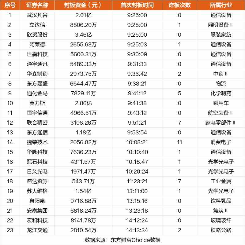 從首次封板時(shí)間角度看,今日23只非ST股中,世嘉科技、通宇通訊在開盤5分鐘內(nèi)首次觸板。