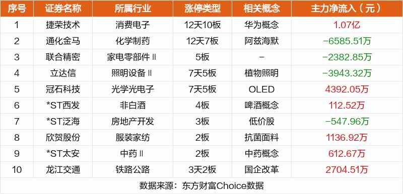 其中,華為概念捷榮技術(shù)12天10板,阿茲海默通化金馬12天7板,聯(lián)合精密5板。