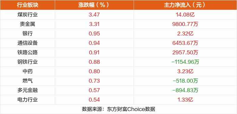 板塊方面,煤炭行業(yè)、貴金屬、銀行等板塊漲幅居前,工程咨詢服務(wù)、電子化學(xué)品、汽車零部件等板塊跌幅居前。