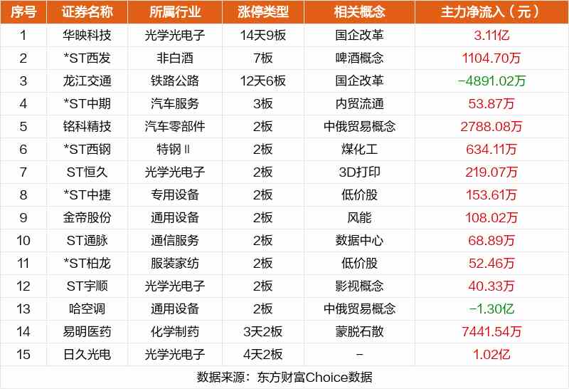 其中,國企改革華映科技14天9板,啤酒概念*ST西發(fā)7板,國企改革龍江交通12天6板。
