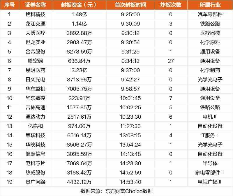 9月19日非連板個(gè)股漲停統(tǒng)計(jì)