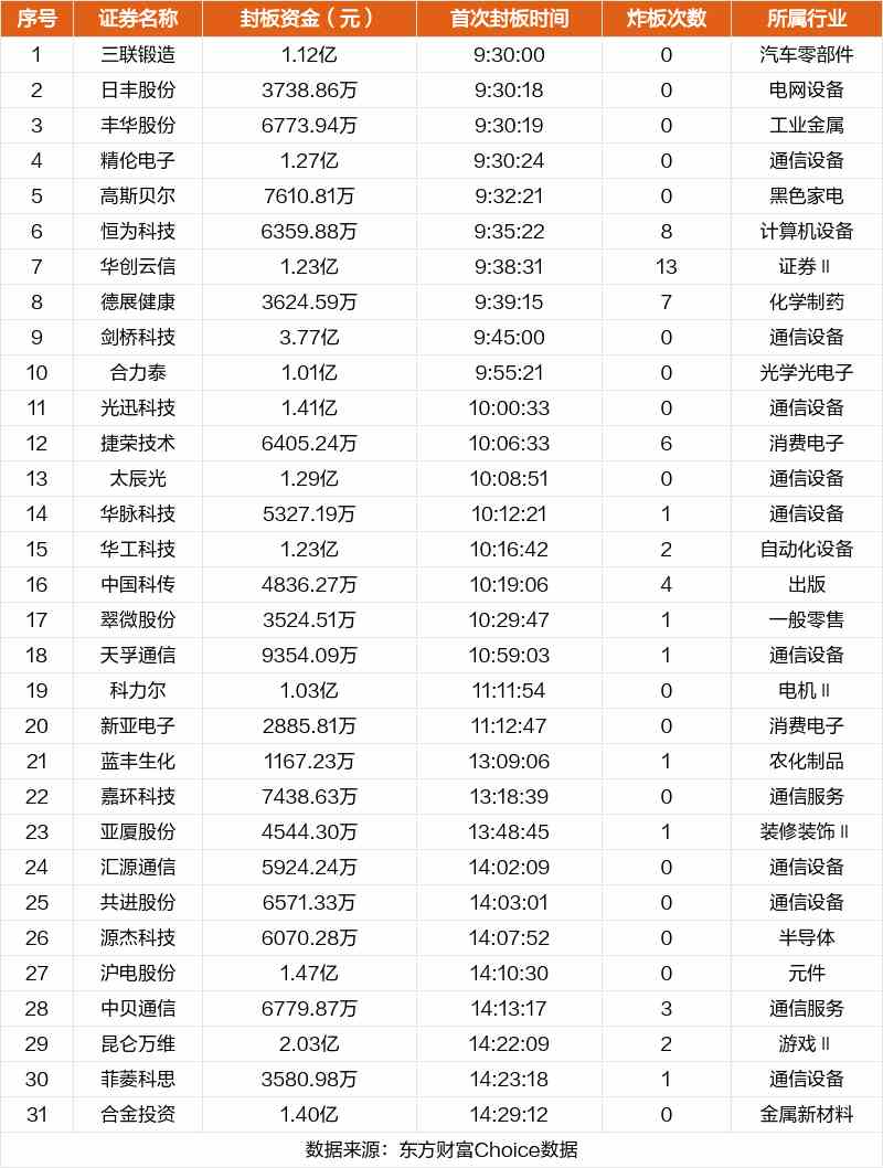 從首次封板時間角度看,今日31只非ST股中,三聯(lián)鍛造、日豐股份、豐華股份等在開盤5分鐘內首次觸板。