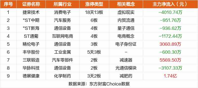 其中,虛擬現(xiàn)實捷榮技術18天13板,內貿流通*ST中期6板,量子通信*ST新海4板。
