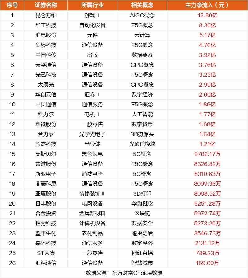 非連板個股方面,昆侖萬維、華工科技、滬電股份主力資金凈流入居前。