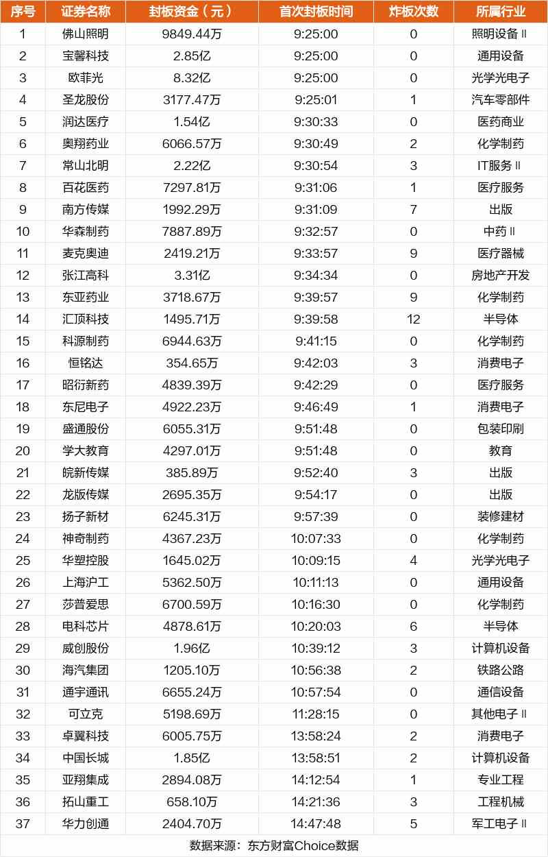 從首次封板時(shí)間角度看,今日37只非ST股中,潤(rùn)達(dá)醫(yī)療、奧翔藥業(yè)、常山北明等在開(kāi)盤(pán)5分鐘內(nèi)首次觸板。