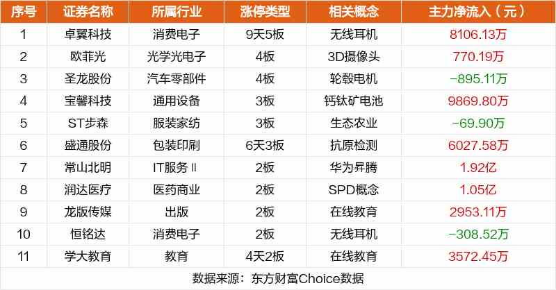 其中,無(wú)線耳機(jī)卓翼科技9天5板,3D攝像頭歐菲光4板,輪轂電機(jī)圣龍股份4板。