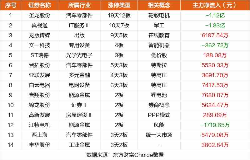 其中,輪轂電機(jī)圣龍股份11板,軍工真視通5板,在線教育龍版?zhèn)髅?天5板。