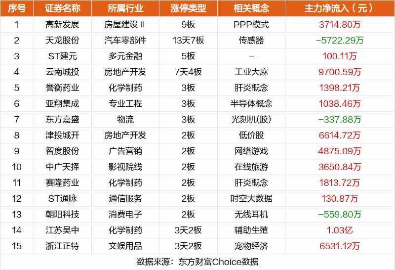 其中,PPP模式高新發(fā)展9板,傳感器天龍股份5板,ST建元5板。