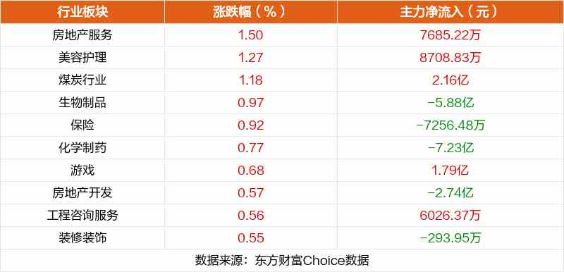 板塊方面,房地產(chǎn)服務(wù)、美容護理、煤炭行業(yè)等板塊漲幅居前,汽車整車、汽車零部件、電機等板塊跌幅居前。