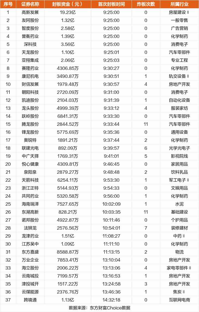 從首次封板時間角度看,今日37只非ST股中,賽隆藥業(yè)、康尼機電、財信發(fā)展等在開盤5分鐘內(nèi)首次觸板。