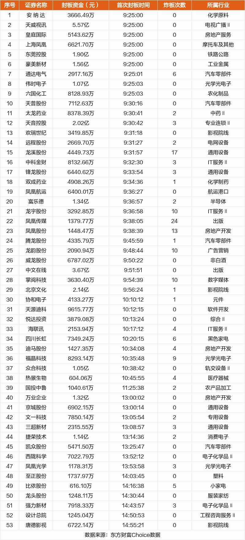 從首次封板時(shí)間角度看,今日53只非ST股中,天普股份、太龍藥業(yè)、天音控股等在開盤5分鐘內(nèi)首次觸板。