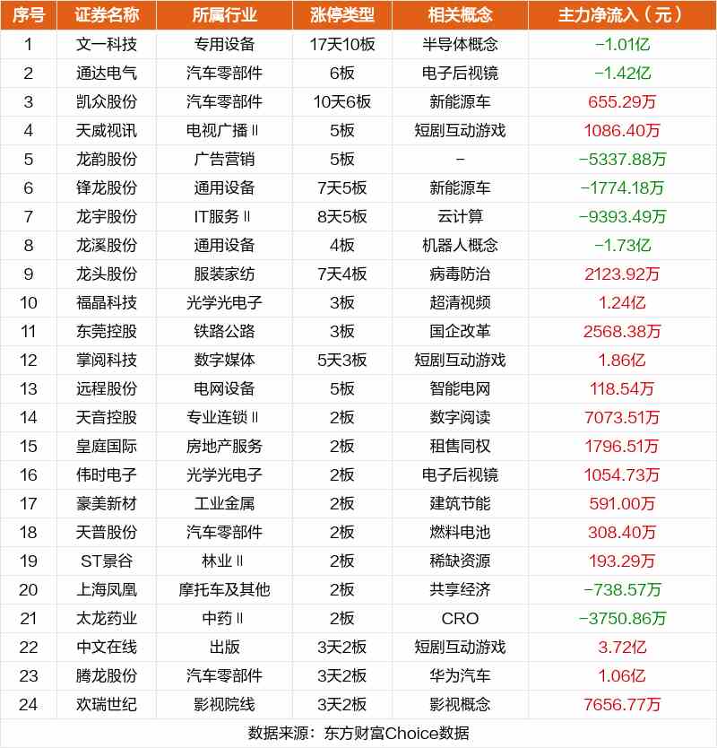 其中,半導(dǎo)體概念文一科技17天10板,電子后視鏡通達(dá)電氣6板,新能源車凱眾股份10天6板。