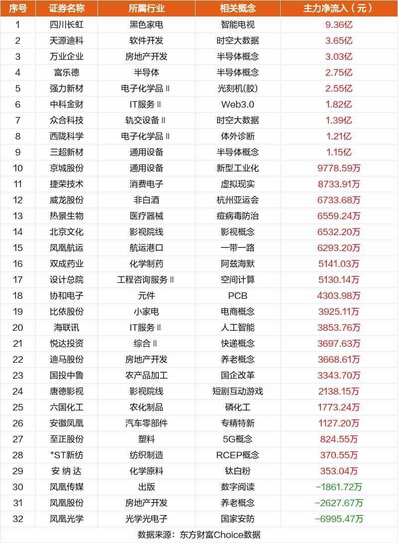 非連板個(gè)股方面,四川長虹、天源迪科、萬業(yè)企業(yè)主力資金凈流入居前。