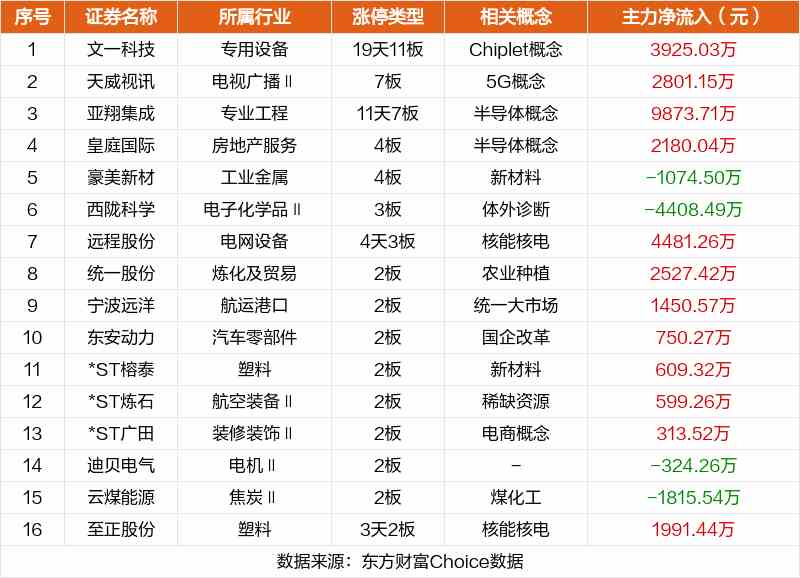 其中,Chiplet概念文一科技19天11板,5G概念天威視訊7板,半導(dǎo)體概念亞翔集成11天7板。