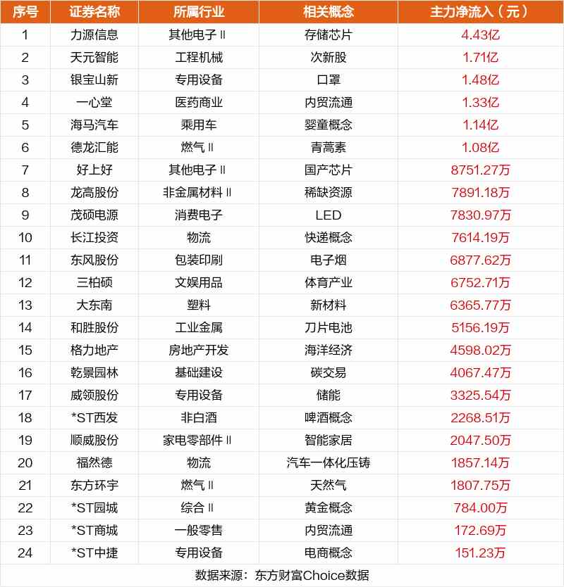 非連板個(gè)股方面,力源信息、天元智能、銀寶山新主力資金凈流入居前。