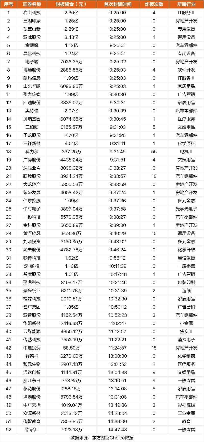從首次封板時(shí)間角度看,今日52只非ST股中,引力傳媒、四通股份、奧特佳等在開盤5分鐘內(nèi)首次觸板。