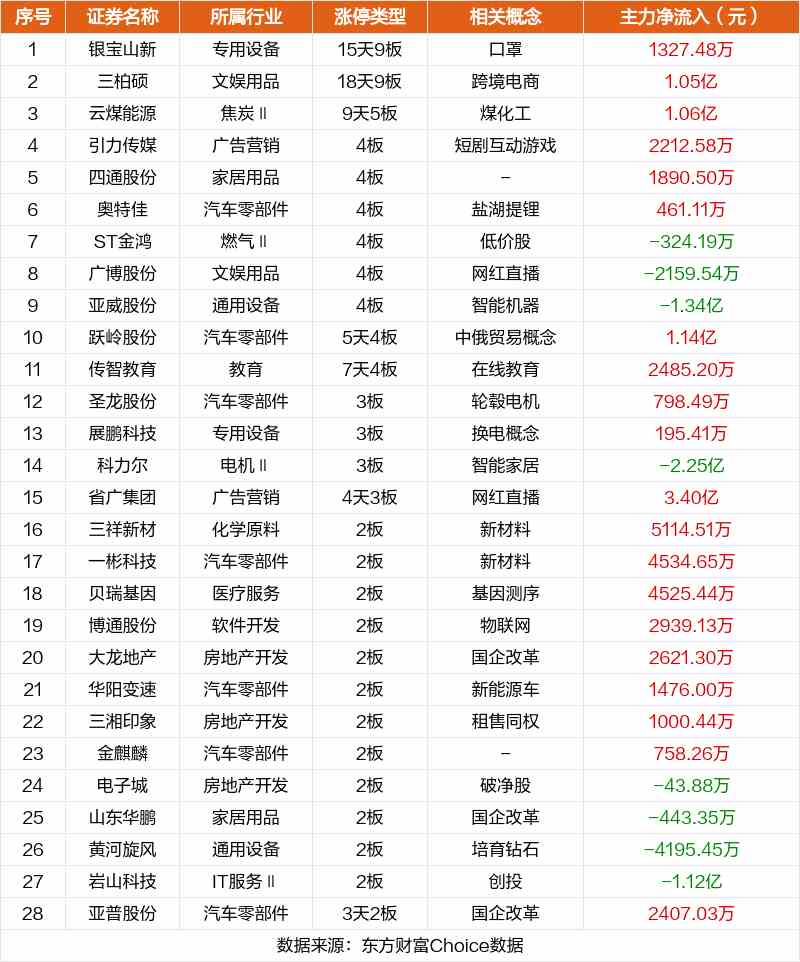 其中,口罩銀寶山新8連板,跨境電商三柏碩8連板,煤化工云煤能源9天5板。