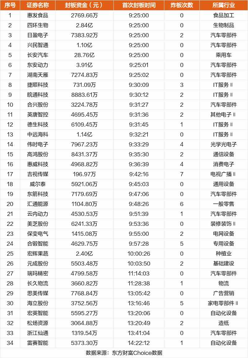 從首次封板時(shí)間角度看,今日34只非ST股中,捷順科技、皖通科技、合興股份等在開盤5分鐘內(nèi)首次觸板。