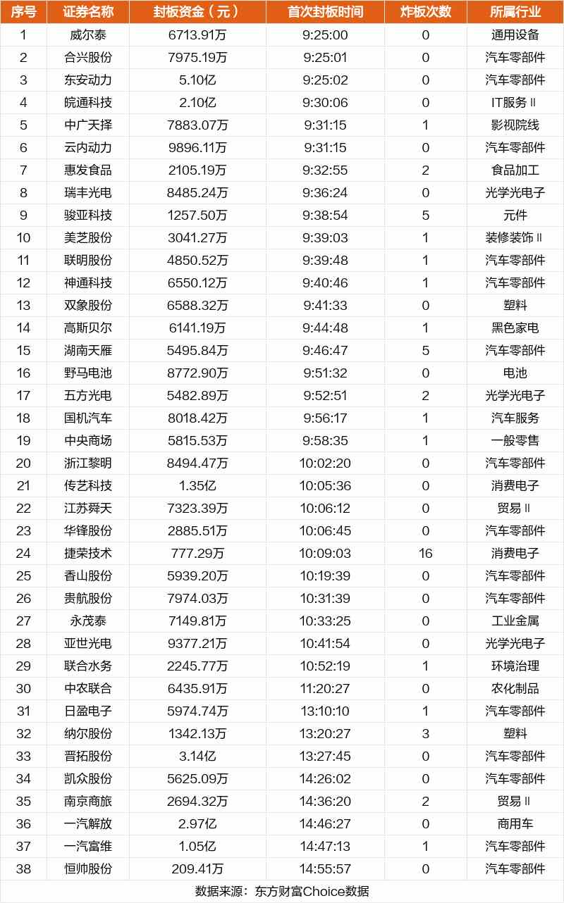 從首次封板時(shí)間角度看,今日38只非ST股中,皖通科技、中廣天擇、云內(nèi)動(dòng)力等在開(kāi)盤5分鐘內(nèi)首次觸板。