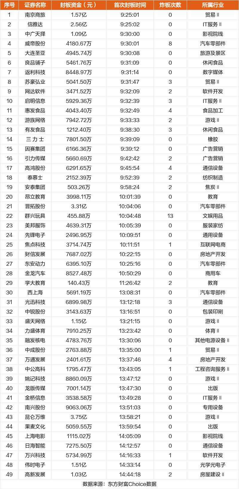 從首次封板時(shí)間角度看,今日49只非ST股中,中廣天擇、威帝股份、大連圣亞等在開(kāi)盤(pán)5分鐘內(nèi)首次觸板。
