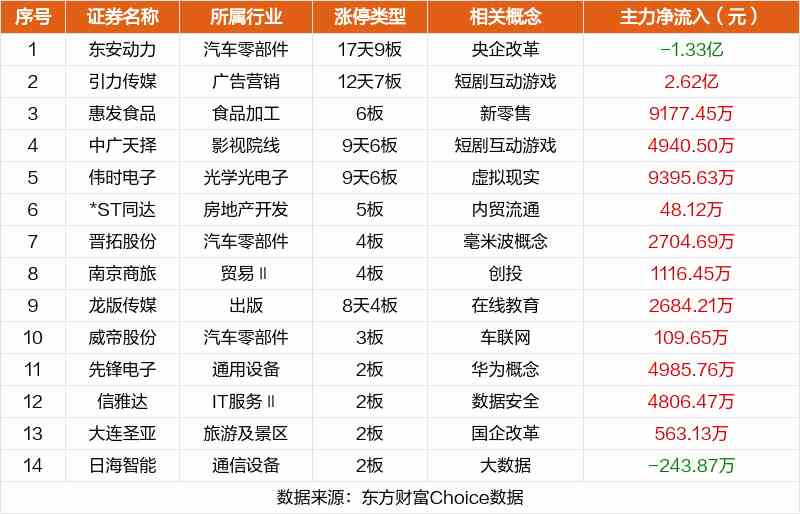 其中,央企改革東安動(dòng)力7連板,短劇互動(dòng)游戲引力傳媒12天7板,新零售惠發(fā)食品6板。