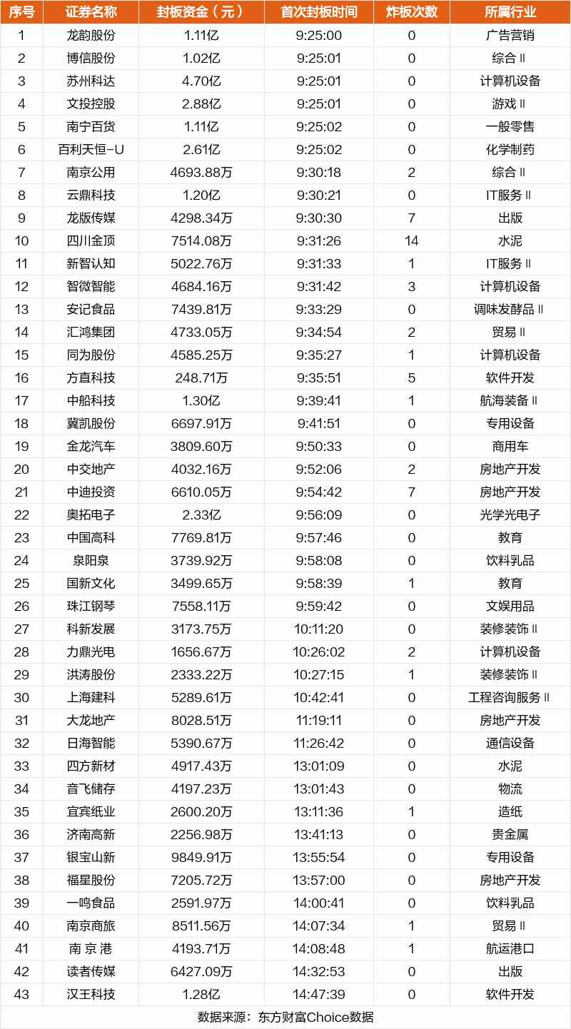 從首次封板時(shí)間角度看,今日43只非ST股中,南京公用、云鼎科技、龍版?zhèn)髅降仍陂_(kāi)盤5分鐘內(nèi)首次觸板。