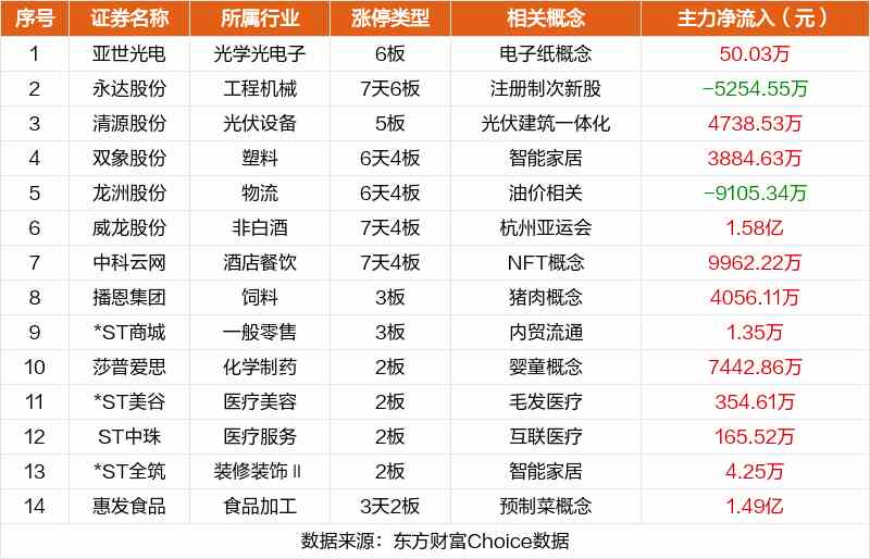 其中,電子紙概念亞世光電6板,注冊制次新股【永達股份(001239)、股吧】7天6板,光伏建筑一體化清源股份5板。