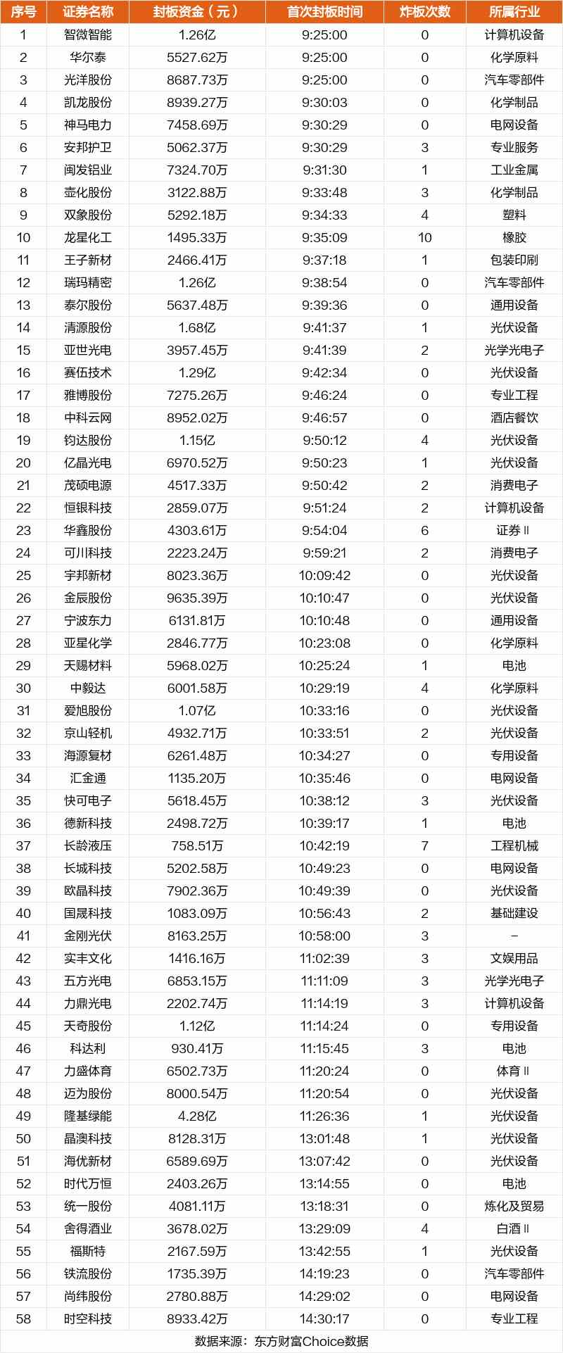 從首次封板時間角度看,今日58只非ST股中,凱龍股份、神馬電力、【安邦護衛(wèi)(603373)、股吧】等在開盤5分鐘內(nèi)首次觸板。