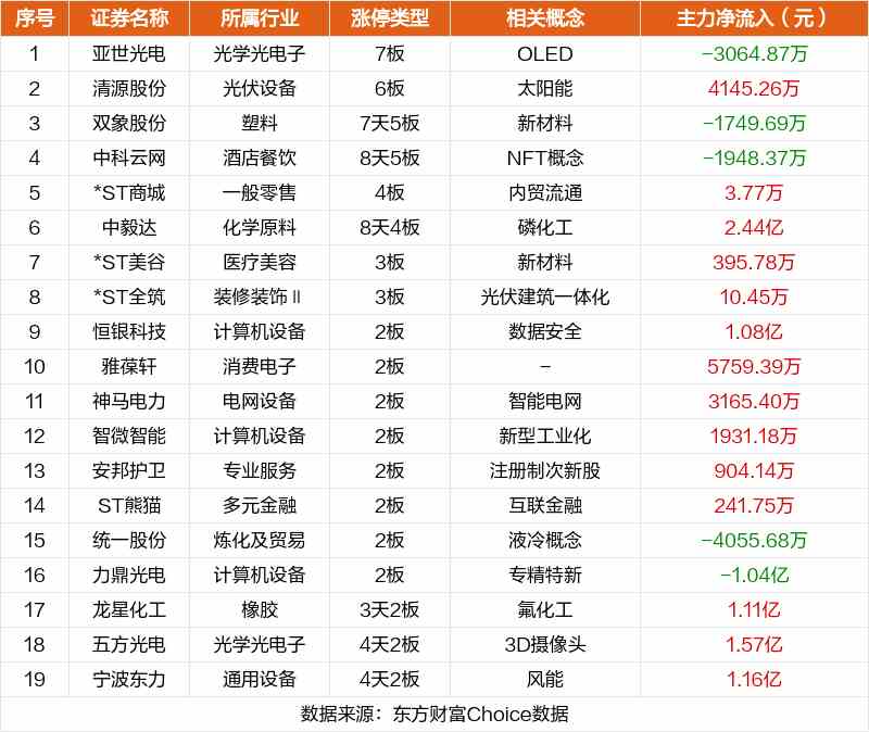 其中,OLED亞世光電7板,太陽能清源股份6板,新材料雙象股份7天5板。
