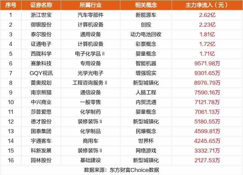 非連板個股方面,浙江世寶、御銀股份、泰爾股份主力資金凈流入居前。