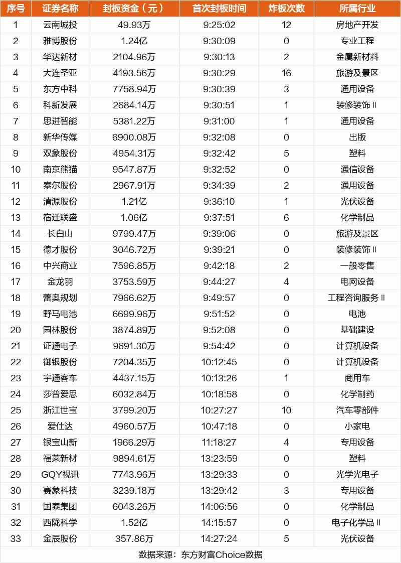 從首次封板時間角度看,今日33只非ST股中,雅博股份、華達新材、大連圣亞等在開盤5分鐘內(nèi)首次觸板。