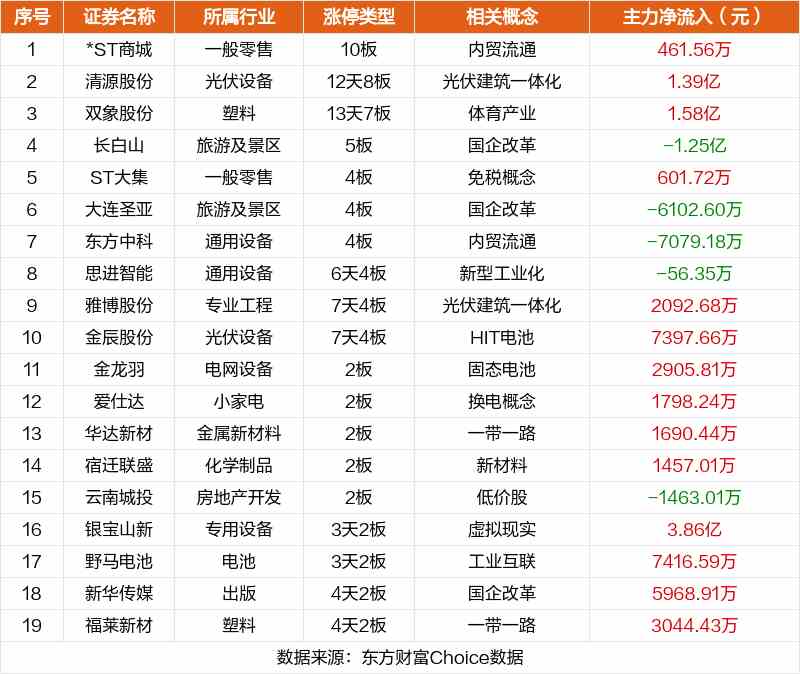 其中,內(nèi)貿(mào)流通*ST商城10板,光伏建筑一體化清源股份12天8板,體育產(chǎn)業(yè)雙象股份13天7板,冰雪概念長白山5板。