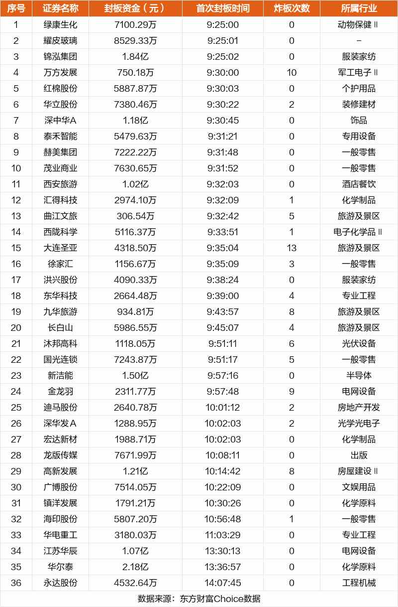 從首次封板時(shí)間角度看,今日36只非ST股中,萬(wàn)方發(fā)展、紅棉股份、華立股份等在開(kāi)盤(pán)5分鐘內(nèi)首次觸板。