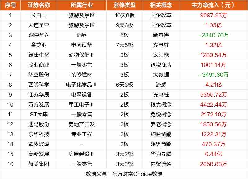 其中,國(guó)企改革長(zhǎng)白山10天8板,國(guó)企改革大連圣亞9天6板,新零售深中華A5板。