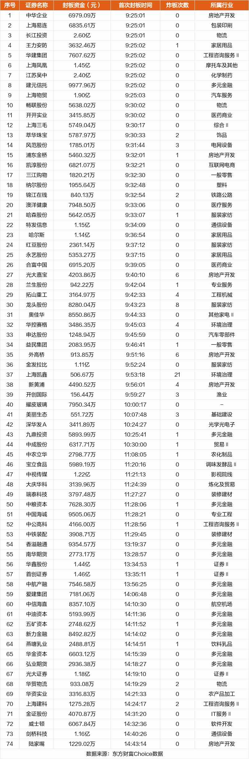 從首次封板時間角度看,今日74只非ST股中,開開實業(yè)、暢聯(lián)股份、上海三毛等在開盤5分鐘內(nèi)首次觸板。