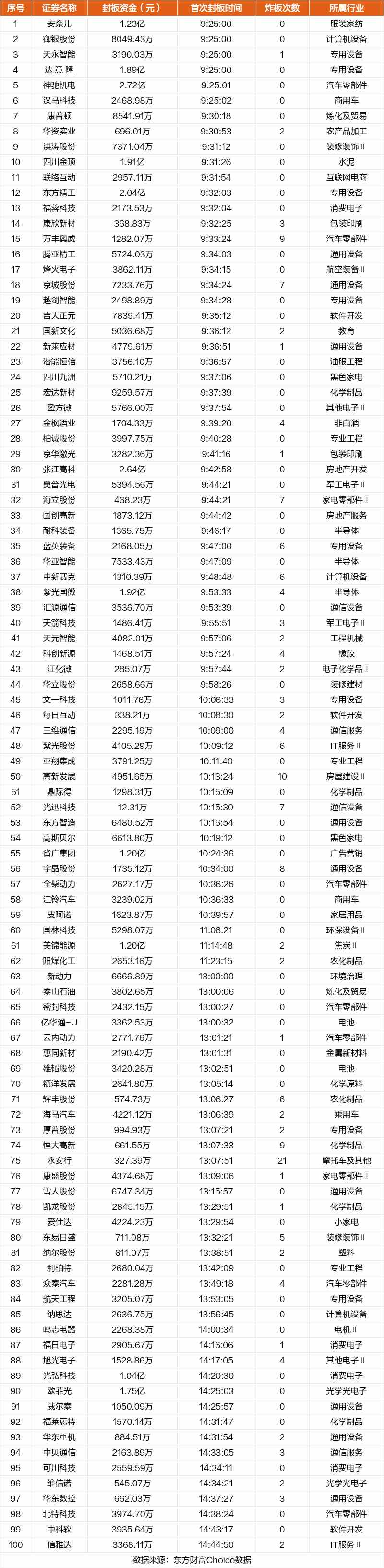 從首次封板時間角度看,今日107只非ST股中,康普頓、華資實業(yè)、洪濤股份等在開盤5分鐘內首次觸板。