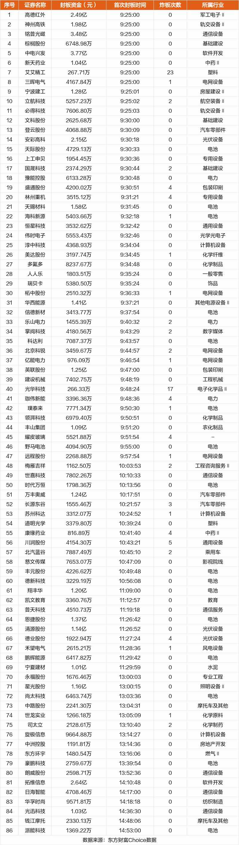 從首次封板時間角度看,今日86只非ST股中,文科股份、登云股份、安彩高科等在開盤5分鐘內(nèi)首次觸板。