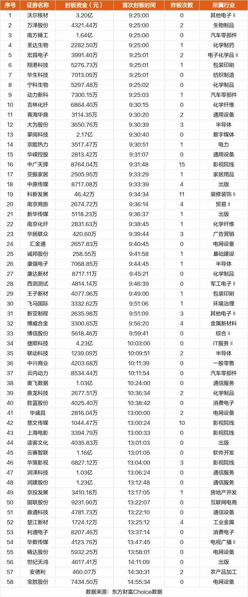 從首次封板時(shí)間角度看,今日58只非ST股中,吉林化纖、青海華鼎、大為股份等在開(kāi)盤5分鐘內(nèi)首次觸板。