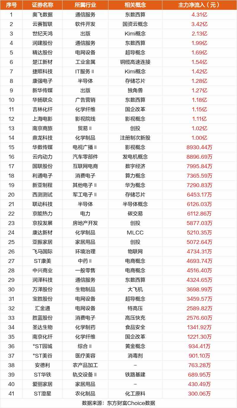 非連板個(gè)股方面,奧飛數(shù)據(jù)、云賽智聯(lián)、世紀(jì)天鴻主力資金凈流入居前。