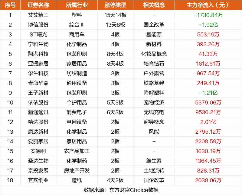 其中,艾艾精工15天14板,國企改革博信股份13天8板(7連板),氫能源ST曙光4板。