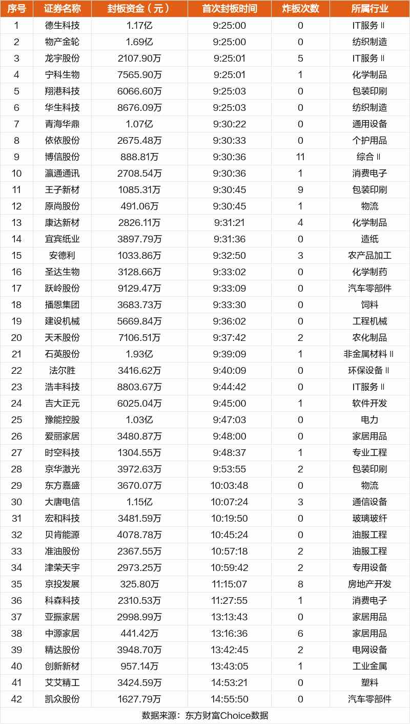 從首次封板時間角度看,今日42只非ST股中,青海華鼎、依依股份、博信股份等在開盤5分鐘內(nèi)首次觸板。